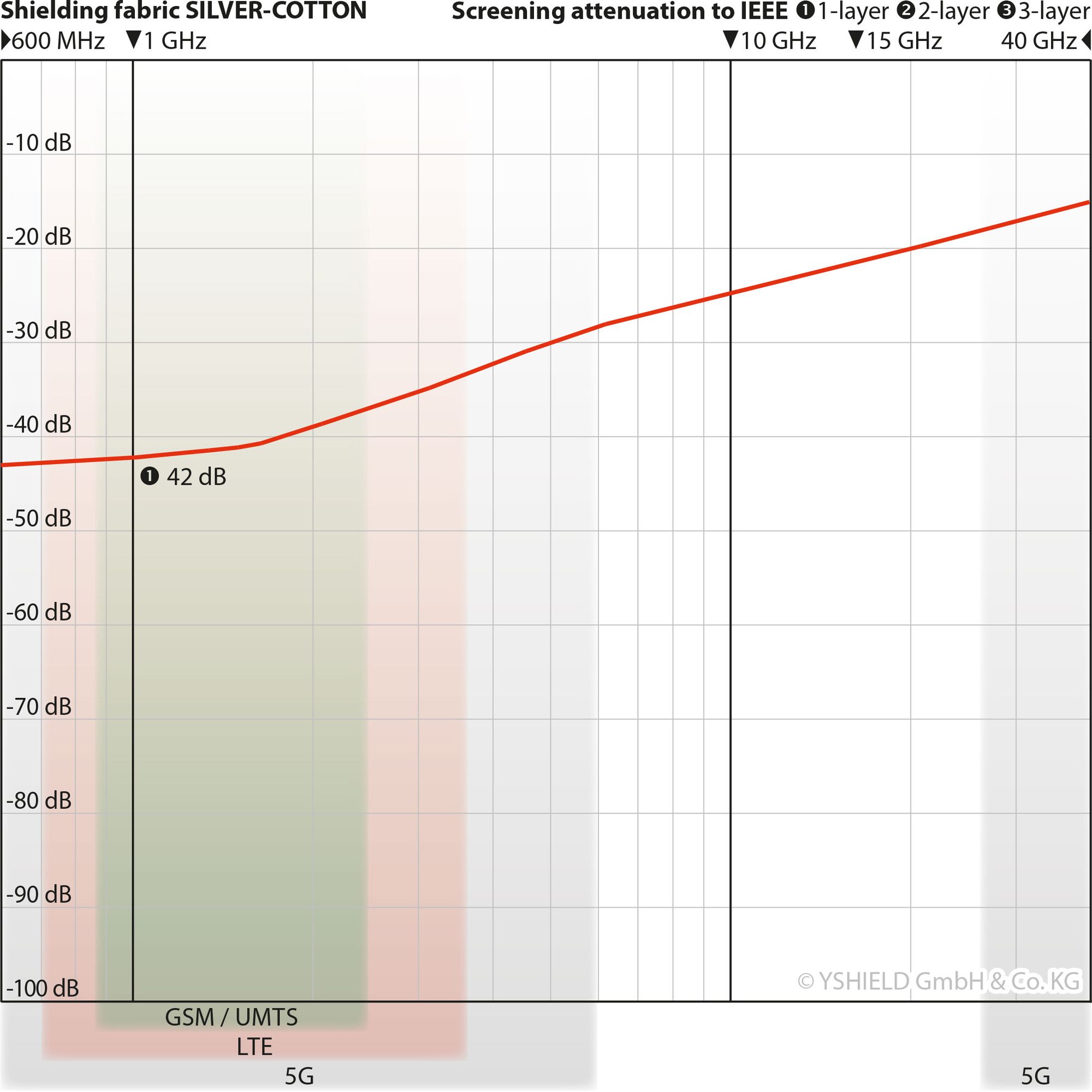 SILVER-COTTON je polopriehľadná bavlnená tkanina s vysokým obsahom striebornej nite na ochranu pred vysokofrekvenčným aj nízkofrekvenčným žiarením. S útlmom 42 dB má táto tkanina vynikajúci pomer cena/výkon. Vysoká transparentnosť pri veľmi vysokom útlme tienenia.
